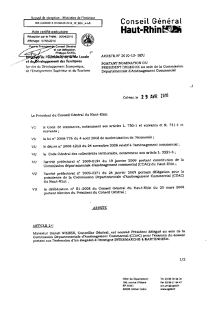 portant nomination du Président Délégué au sein de la Commission Départementale d'Aménagement Commercial. Resumé Pièces jointes ARRETE Assemblée : Non défini Date : 29/04/2010 Rapporteur : Non défini Collectivité : Conseil départemental du Haut-Rhin Direction : Non défini Service : Service Développement Economique Domaine : Autres (non classés) Commission :