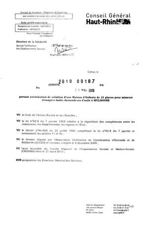 portant autorisation de création d'une maison d'enfants de 15 places pour mineurs étrangers isolés demandeurs d'asile à MULHOUSE. Resumé Pièces jointes ARRETE Assemblée : Non défini Date : 05/05/2010 Rapporteur : Non défini Collectivité : Conseil départemental du Haut-Rhin Direction : Non défini Service : Direction de l'Autonomie Domaine : Accueil d'enfants Commission :