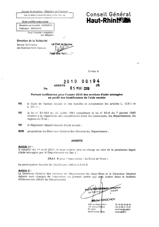 portant tarification pour l'année 2010 des services d'aide ménagère au profit des bénéficiaires de l'aide sociale. Resumé Pièces jointes ARRETE Assemblée : Non défini Date : 05/05/2010 Rapporteur : Non défini Collectivité : Conseil départemental du Haut-Rhin Direction : Non défini Service : Direction de l'Autonomie Domaine : Autres (non classés) Commission :