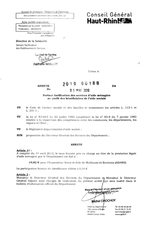 portant tarification des services d'aide ménagère au profit des bénéficiaires de l'aide sociale. Resumé Pièces jointes ARRETE Assemblée : Non défini Date : 05/05/2010 Rapporteur : Non défini Collectivité : Conseil départemental du Haut-Rhin Direction : Non défini Service : Direction de l'Autonomie Domaine : Autres (non classés) Commission :