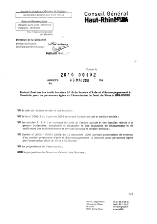 portant fixation des tarifs horaires 2010 du service d'aide et d'accompagnement à domicile pour les personnes âgées de l'association Le Droit de Vivre à MULHOUSE. Resumé Pièces jointes ARRETE Assemblée : Non défini Date : 05/05/2010 Rapporteur : Non défini Collectivité : Conseil départemental du Haut-Rhin Direction : Non défini Service : Direction de l'Autonomie Domaine : Personnes Agées Commission :