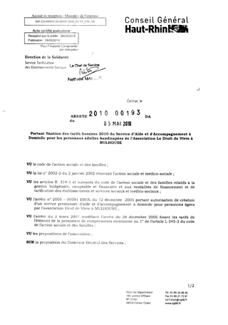 portant fixation des tarifs horaires 2010 du service d'aide et d'accompagnement à domicile pour les personnes adultes handicapées de l'association Le Droit de Vivre à MULHOUSE. Resumé Pièces jointes ARRETE Assemblée : Non défini Date : 05/05/2010 Rapporteur : Non défini Collectivité : Conseil départemental du Haut-Rhin Direction : Non défini Service : Direction de l'Autonomie Domaine : Autres (non classés) Commission :