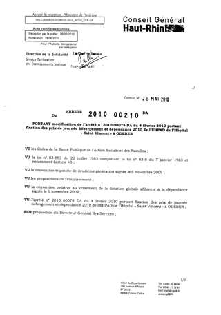 portant modification de l'arrêté n°2010-00078-DA du 04.02.2010 portant fixation des prix de journée hébergement et dépendance 2010 de l'EHPAD de l'Hôpital "Saint Vincent" à ODEREN. Resumé Pièces jointes ARRETE Assemblée : Non défini Date : 26/05/2010 Rapporteur : Non défini Collectivité : Conseil départemental du Haut-Rhin Direction : Non défini Service : Direction de l'Autonomie Domaine : Prix de Journée Commission :