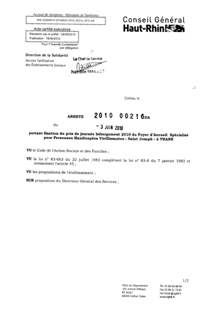 portant fixation du prix de journée hébergement 2010 du foyer d'accueil spécialisé pour personnes handicapées vieillissantes "Saint Joseph" à THANN. Resumé Pièces jointes ARRETE Assemblée : Non défini Date : 03/06/2010 Rapporteur : Non défini Collectivité : Conseil départemental du Haut-Rhin Direction : Non défini Service : Direction de l'Autonomie Domaine : Prix de Journée Commission :