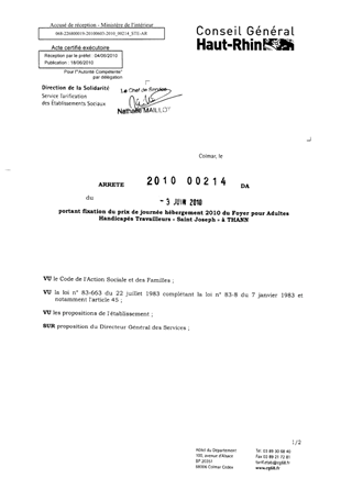 portant fixation du prix de journée hébergement 2010 du foyer pour adultes handicapés travailleurs "Saint Joseph" à THANN. Resumé Pièces jointes ARRETE Assemblée : Non défini Date : 03/06/2010 Rapporteur : Non défini Collectivité : Conseil départemental du Haut-Rhin Direction : Non défini Service : Direction de l'Autonomie Domaine : Prix de Journée Commission :