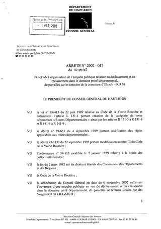 Portant organisation de l'enquête publique relative au déclassement et au reclassement dans le domaine privé départemental, de parcelles sur le territoire de la commune d'Illzach - RD 38 Resumé Pièces jointes ARRETE Assemblée : Non défini Date : 30/09/2002 Rapporteur : Non défini Collectivité : Conseil départemental du Haut-Rhin Direction : Non défini Service : Service du Patrimoine et du droit des Sols Domaine : Déclassement de voirie Commission :
