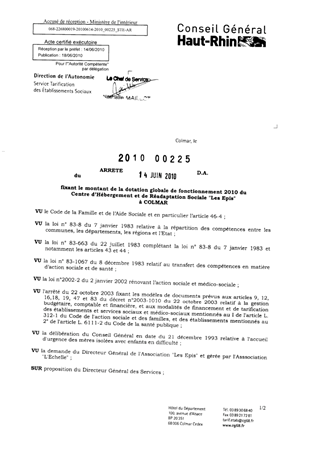 fixant le montant de la dotation globale de fonctionnement 2010 du centre d'hébergement et de réadaptation sociale "Les Epis" à COLMAR. Resumé Pièces jointes ARRETE Assemblée : Non défini Date : 14/06/2010 Rapporteur : Non défini Collectivité : Conseil départemental du Haut-Rhin Direction : Non défini Service : Direction de l'Autonomie Domaine : Dotations financières Commission :