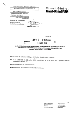 portant fixation des prix de journée hébergement et dépendance 2010 de l'Etablissement d'Hébergement pour Personnes Agées (EHPA) "Home Saint-Gilles" à COLMAR. Resumé Pièces jointes ARRETE Assemblée : Non défini Date : 15/06/2010 Rapporteur : Non défini Collectivité : Conseil départemental du Haut-Rhin Direction : Non défini Service : Direction de l'Autonomie Domaine : Prix de Journée Commission :
