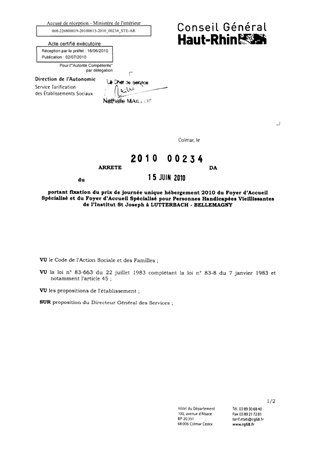 portant fixation du prix de journée unique hébergement 2010 du foyer d'accueil spécialisé et du foyer d'accueil spécialisé pour personnes handicapées vieillissantes de l'Institut St Joseph à LUTTERBACH - BELLEMAGNY. Resumé Pièces jointes ARRETE Assemblée : Non défini Date : 15/06/2010 Rapporteur : Non défini Collectivité : Conseil départemental du Haut-Rhin Direction : Non défini Service : Direction de l'Autonomie Domaine : Prix de Journée Commission :