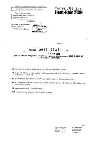 portant fixation des prix de journée hébergement et dépendance 2010 de l'EHPAD "La Roselière" à KUNHEIM. Resumé Pièces jointes ARRETE Assemblée : Non défini Date : 15/06/2010 Rapporteur : Non défini Collectivité : Conseil départemental du Haut-Rhin Direction : Non défini Service : Direction de l'Autonomie Domaine : Prix de Journée Commission :