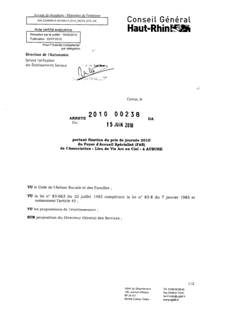 portant fixation du prix de journée 2010 du foyer d'accueil spécialisé (FAS) de l'association "Lieu de Vie Arc en Ciel" à AUBURE. Resumé Pièces jointes ARRETE Assemblée : Non défini Date : 15/06/2010 Rapporteur : Non défini Collectivité : Conseil départemental du Haut-Rhin Direction : Non défini Service : Direction de l'Autonomie Domaine : Prix de Journée Commission :