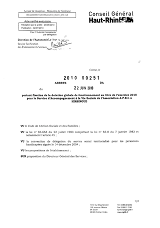 portant fixation de la dotation globale de fonctionnement au titre de l'exercice 2010 pour le service d'accompagnement à la vie sociale de l'association A.P.E.I. à HIRSINGUE. Resumé Pièces jointes ARRETE Assemblée : Non défini Date : 22/06/2010 Rapporteur : Non défini Collectivité : Conseil départemental du Haut-Rhin Direction : Non défini Service : Direction de l'Autonomie Domaine : Dotations financières Commission :
