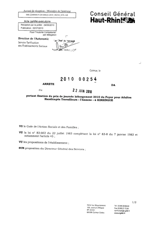 portant fixation du prix de journée hébergement 2010 du foyer pour adultes handicapés travailleurs "l'Annexe" à HIRSINGUE. Resumé Pièces jointes ARRETE Assemblée : Non défini Date : 22/06/2010 Rapporteur : Non défini Collectivité : Conseil départemental du Haut-Rhin Direction : Non défini Service : Direction de l'Autonomie Domaine : Prix de Journée Commission :