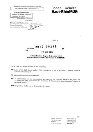 portant fixation du prix de journée 2010 de la maison d'enfants "Le Chalet" à RIMBACH. Resumé Pièces jointes ARRETE Assemblée : Non défini Date : 22/06/2010 Rapporteur : Non défini Collectivité : Conseil départemental du Haut-Rhin Direction : Non défini Service : Direction de l'Autonomie Domaine : Prix de Journée Commission :