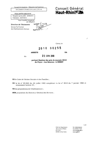 portant fixation des prix de journée 2010 du foyer "Les Sources" à ORBEY. Resumé Pièces jointes ARRETE Assemblée : Non défini Date : 22/06/2010 Rapporteur : Non défini Collectivité : Conseil départemental du Haut-Rhin Direction : Non défini Service : Direction de l'Autonomie Domaine : Prix de Journée Commission :