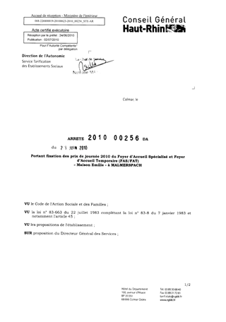 portant fixation des prix de journée 2010 du foyer d'accueil spécialisé et foyer d'accueil temporaire (FAS/FAT) "Maison Emilie" à MALPERSPACH. Resumé Pièces jointes ARRETE Assemblée : Non défini Date : 23/06/2010 Rapporteur : Non défini Collectivité : Conseil départemental du Haut-Rhin Direction : Non défini Service : Direction de l'Autonomie Domaine : Prix de Journée Commission :