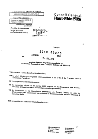portant fixation du prix de journée 2010 du service d'accueil de jour "Gustave Stricker" à ILLZACH. Resumé Pièces jointes ARRETE Assemblée : Non défini Date : 07/07/2010 Rapporteur : Non défini Collectivité : Conseil départemental du Haut-Rhin Direction : Non défini Service : Direction de l'Autonomie Domaine : Prix de Journée Commission :