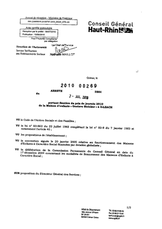 portant fixation du prix de journée 2010 de la maison d'enfants "Gustave Stricker" à ILLZACH. Resumé Pièces jointes ARRETE Assemblée : Non défini Date : 07/07/2010 Rapporteur : Non défini Collectivité : Conseil départemental du Haut-Rhin Direction : Non défini Service : Direction de l'Autonomie Domaine : Prix de Journée Commission :