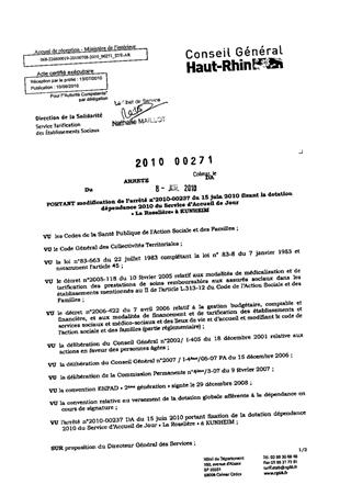 portant modification de l'arrêté n° 2010-00237 du 15.06.2010 fixant la dotation dépendance 2010 du service d'accueil de jour "La Roselière" à KUNHEIM. Resumé Pièces jointes ARRETE Assemblée : Non défini Date : 08/07/2010 Rapporteur : Non défini Collectivité : Conseil départemental du Haut-Rhin Direction : Non défini Service : Direction de l'Autonomie Domaine : Dotations financières Commission :