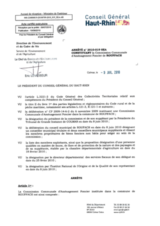 constituant la Commission Communale d'Aménagement Foncier de ROUFFACH. Resumé Pièces jointes ARRETE Assemblée : Non défini Date : 09/07/2010 Rapporteur : Non défini Collectivité : Conseil départemental du Haut-Rhin Direction : Non défini Service : Direction de l'Environnement et du Cadre de Vie Domaine : Autres (non classés) Commission :