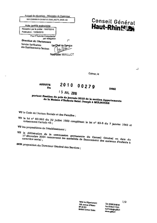 portant fixation du prix de journée 2010 de la section appartements de la maison d'enfants Saint Joseph à MULHOUSE. Resumé Pièces jointes ARRETE Assemblée : Non défini Date : 15/07/2010 Rapporteur : Non défini Collectivité : Conseil départemental du Haut-Rhin Direction : Non défini Service : Direction de l'Autonomie Domaine : Prix de Journée Commission :
