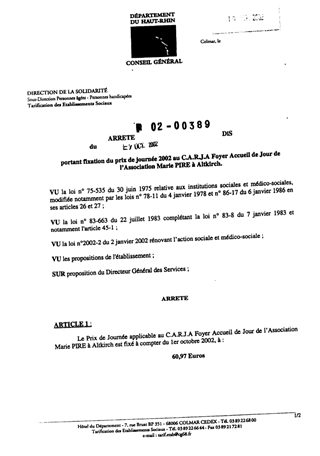 portant fixation du prix de journée 2002 au CARJA Foyer Accueil de Jour de l'Association Marie PIRE à ALTKIRCH. Resumé Pièces jointes ARRETE Assemblée : Non défini Date : 07/10/2002 Rapporteur : Non défini Collectivité : Conseil départemental du Haut-Rhin Direction : Non défini Service : Direction Adjointe Personnes Agées et Personnes Handicapées Domaine : Prix de Journée Commission :