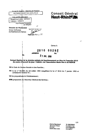 portant fixation de la dotation globale de fonctionnement au titre de l'exercice 2010 du centre d'accueil de jour "Carja" de l'association Marie Pire à ALTKIRCH. Resumé Pièces jointes ARRETE Assemblée : Non défini Date : 27/07/2010 Rapporteur : Non défini Collectivité : Conseil départemental du Haut-Rhin Direction : Non défini Service : Direction de l'Autonomie Domaine : Dotations financières Commission :