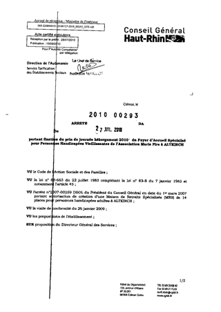 portant fixation du prix de journée hébergement 2010 du foyer d'accueil spécialisé pour personnes handicapées vieillissantes de l'association Marie Pire à ALTKIRCH. Resumé Pièces jointes ARRETE Assemblée : Non défini Date : 27/07/2010 Rapporteur : Non défini Collectivité : Conseil départemental du Haut-Rhin Direction : Non défini Service : Direction de l'Autonomie Domaine : Prix de Journée Commission :