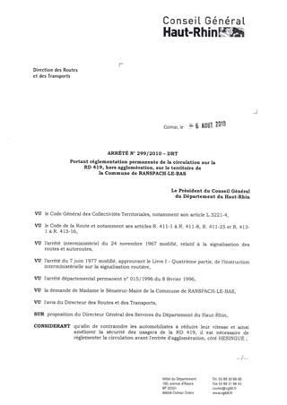 portant réglementation permanente de la circulation sur la RD 419, hors agglomération, sur le territoire de la commune de RANSPACH-LE-BAS. Resumé Pièces jointes ARRETE Assemblée : Non défini Date : 06/08/2010 Rapporteur : Non défini Collectivité : Conseil départemental du Haut-Rhin Direction : Non défini Service : Direction des Routes Domaine : Circulation Commission :