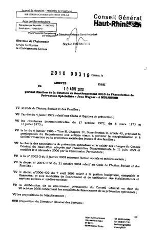 portant fixation de la dotation de fonctionnement 2010 de l'association de prévention spécialisée "Jean Wagner" à MULHOUSE. Resumé Pièces jointes ARRETE Assemblée : Non défini Date : 10/08/2010 Rapporteur : Non défini Collectivité : Conseil départemental du Haut-Rhin Direction : Non défini Service : Direction de l'Autonomie Domaine : Dotations financières Commission :
