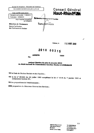 portant fixation du prix de journée 2010 du multi accueil de l'association Caroline Binder à LOGELBACH. Resumé Pièces jointes ARRETE Assemblée : Non défini Date : 10/08/2010 Rapporteur : Non défini Collectivité : Conseil départemental du Haut-Rhin Direction : Non défini Service : Direction de l'Autonomie Domaine : Prix de Journée Commission :