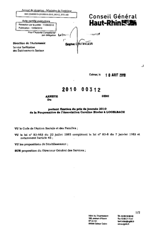 portant fixation du prix de journée 2010 de la pouponnière de l'association Caroline Binder à LOGELBACH. Resumé Pièces jointes ARRETE Assemblée : Non défini Date : 10/08/2010 Rapporteur : Non défini Collectivité : Conseil départemental du Haut-Rhin Direction : Non défini Service : Direction de l'Autonomie Domaine : Prix de Journée Commission :