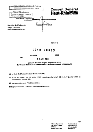 portant fixation du prix de journée 2010 du centre maternel de l'association Caroline Binder à LOGELBACH. Resumé Pièces jointes ARRETE Assemblée : Non défini Date : 10/08/2010 Rapporteur : Non défini Collectivité : Conseil départemental du Haut-Rhin Direction : Non défini Service : Direction de l'Autonomie Domaine : Prix de Journée Commission :