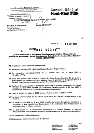 portant fixation de la dotation de fonctionnement 2010 de l'association de prévention spécialisée "Action de Prévention Spécialisée des Inadaptations Sociales" (APSIS) à MULHOUSE. Resumé Pièces jointes ARRETE Assemblée : Non défini Date : 10/08/2010 Rapporteur : Non défini Collectivité : Conseil départemental du Haut-Rhin Direction : Non défini Service : Direction de l'Autonomie Domaine : Dotations financières Commission :