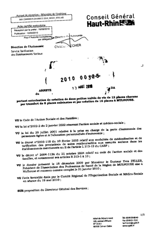 portant autorisation de création de deux petites unités de vie de 12 places chacune par transfert de 8 places existantes et par création de 16 places à MULHOUSE. Resumé Pièces jointes ARRETE Assemblée : Non défini Date : 13/08/2010 Rapporteur : Non défini Collectivité : Conseil départemental du Haut-Rhin Direction : Non défini Service : Direction de l'Autonomie Domaine : Autres (non classés) Commission :