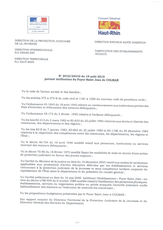 portant tarification du foyer Saint Jean de COLMAR. Resumé Pièces jointes ARRETE Assemblée : Non défini Date : 19/08/2010 Rapporteur : Non défini Collectivité : Conseil départemental du Haut-Rhin Direction : Non défini Service : Direction Enfance Santé Insertion Domaine : Prix de Journée Commission :