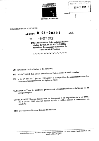 Portant décision de fermeture définitive du lieu de vie Lac Blanc à ORBEY accueillant des mineurs bénéficiaires de l'aide sociale à l'enfance. Resumé Pièces jointes ARRETE Assemblée : Non défini Date : 09/10/2002 Rapporteur : Non défini Collectivité : Conseil départemental du Haut-Rhin Direction : Non défini Service : Direction de la Solidarité Domaine : Autres (non classés) Commission :