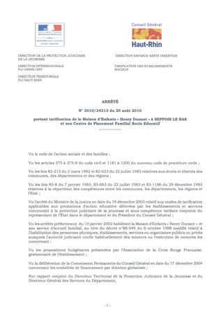 portant tarification de la maison d'enfants "Henry Dunant" à SEPPOIS LE BASet son centre de placement familial socio-éducatif. Resumé Pièces jointes ARRETE Assemblée : Non défini Date : 20/08/2010 Rapporteur : Non défini Collectivité : Conseil départemental du Haut-Rhin Direction : Non défini Service : Direction Enfance Santé Insertion Domaine : Prix de Journée Commission :