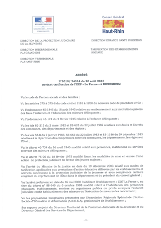 portant tarification de l'EEP "La Ferme" à RIEDISHEIM. Resumé Pièces jointes ARRETE Assemblée : Non défini Date : 20/08/2010 Rapporteur : Non défini Collectivité : Conseil départemental du Haut-Rhin Direction : Non défini Service : Direction Enfance Santé Insertion Domaine : Prix de Journée Commission :