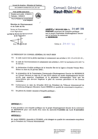 ortant ouverture de l'enquête publique sur le projet d'opération d'aménagement foncier sur le territoire de la commune de REININGUE. Resumé Pièces jointes ARRETE Assemblée : Non défini Date : 20/08/2010 Rapporteur : Non défini Collectivité : Conseil départemental du Haut-Rhin Direction : Non défini Service : Direction de l'Environnement et du Cadre de Vie Domaine : Autres (non classés) Commission :