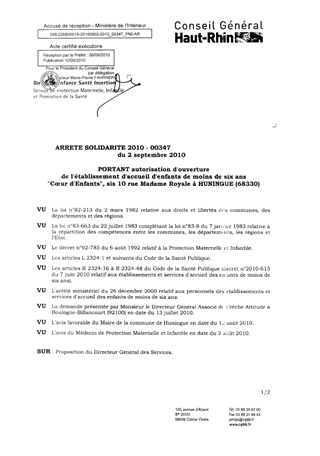 portant autorisation d'ouverture de l'établissement d'accueil d'enfants de moins de six ans "Coeur d'Enfants", sis 10 rue Madame Royale à HUNINGUE (68330). Resumé Pièces jointes ARRETE Assemblée : Non défini Date : 02/09/2010 Rapporteur : Non défini Collectivité : Conseil départemental du Haut-Rhin Direction : Non défini Service : Direction Enfance Santé Insertion Domaine : Accueil d'enfants Commission :