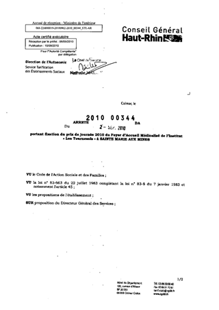 portant fixation du prix de journée 2010 du foyer d'accueil médicalisé de l'Institut "Les Tournesols" à SAINTE MARIE AUX MINES. Resumé Pièces jointes ARRETE Assemblée : Non défini Date : 02/09/2010 Rapporteur : Non défini Collectivité : Conseil départemental du Haut-Rhin Direction : Non défini Service : Direction de l'Autonomie Domaine : Prix de Journée Commission :