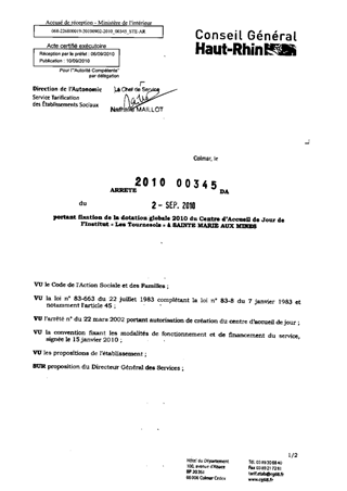 portant fixation de la dotation globale 2010 du centre d'accueil de jour de l'Institut "Les Tournesols" à SAINTE MARIE AUX MINES. Resumé Pièces jointes ARRETE Assemblée : Non défini Date : 02/09/2010 Rapporteur : Non défini Collectivité : Conseil départemental du Haut-Rhin Direction : Non défini Service : Direction de l'Autonomie Domaine : Dotations financières Commission :