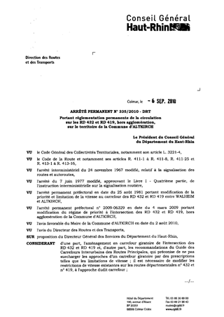 portant réglementation permanente de la circulation sur les RD 432 et RD 419, hors agglomération, sur le territoire de la commune d'ALTKIRCH. Resumé Pièces jointes ARRETE Assemblée : Non défini Date : 06/09/2010 Rapporteur : Non défini Collectivité : Conseil départemental du Haut-Rhin Direction : Non défini Service : Direction des Routes Domaine : Circulation Commission :
