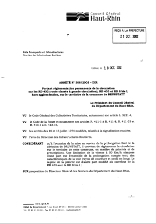 Portant réglementation permanente de la circulation sur les RD 432 (route déclassée à grande circulation), RD 433 et RD 8 bis I, hors agglomération, sur le territoire de la commune de BRUNSTATT Resumé Pièces jointes ARRETE Assemblée : Non défini Date : 18/10/2002 Rapporteur : Non défini Collectivité : Conseil départemental du Haut-Rhin Direction : Non défini Service : Direction des Routes Domaine : Circulation Commission :