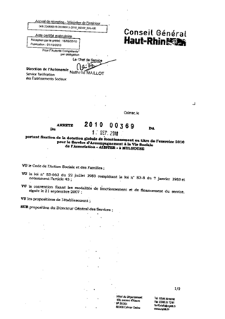 portant fixation de la dotation globale de fonctionnement au titre de l'exercice 2010 pour le service d'accompagnement à la vie sociale de l'Association "Alister" à MULHOUSE. Resumé Pièces jointes ARRETE Assemblée : Non défini Date : 15/09/2010 Rapporteur : Non défini Collectivité : Conseil départemental du Haut-Rhin Direction : Non défini Service : Direction de l'Autonomie Domaine : Dotations financières Commission :
