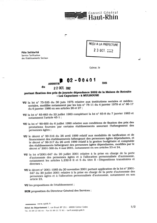 Portant fixation des prix de journée dépendance 2002 de la Maison de Retraite "Les Capucines" à MULHOUSE. Resumé Pièces jointes ARRETE Assemblée : Non défini Date : 22/10/2002 Rapporteur : Non défini Collectivité : Conseil départemental du Haut-Rhin Direction : Non défini Service : Direction de la Solidarité Domaine : Prix de Journée Commission :