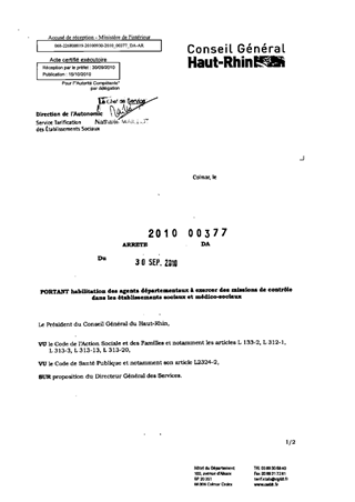 portant habilitation des agents départementaux à exercer des missions de contrôle dans les établissements sociaux et médico-sociaux. Resumé Pièces jointes ARRETE Assemblée : Non défini Date : 30/09/2010 Rapporteur : Non défini Collectivité : Conseil départemental du Haut-Rhin Direction : Non défini Service : Direction de l'Autonomie Domaine : Autres (non classés) Commission :