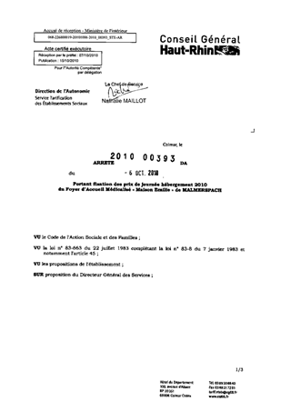portant fixation des prix de journée hébergement 2010 du foyer d'accueil médicalisé "Maison Emilie" de MALMERSPACH. Resumé Pièces jointes ARRETE Assemblée : Non défini Date : 06/10/2010 Rapporteur : Non défini Collectivité : Conseil départemental du Haut-Rhin Direction : Non défini Service : Direction de l'Autonomie Domaine : Prix de Journée Commission :
