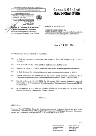 portant nomination au sein de la Commission Départementale d'Agrément Commercial Resumé Pièces jointes ARRETE Assemblée : Non défini Date : 12/10/2010 Rapporteur : Non défini Collectivité : Conseil départemental du Haut-Rhin Direction : Non défini Service : Direction Générale Adjointe du Développement des Territoires, de la Vie Locale et des Infrastructures Domaine : Autres (non classés) Commission :